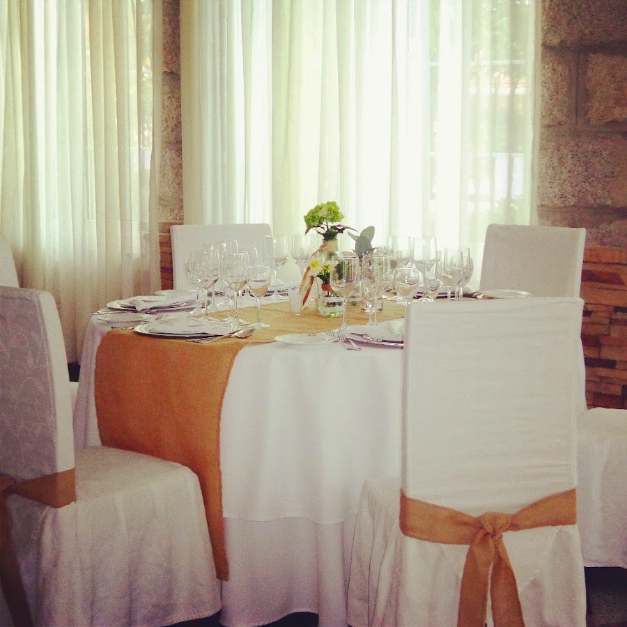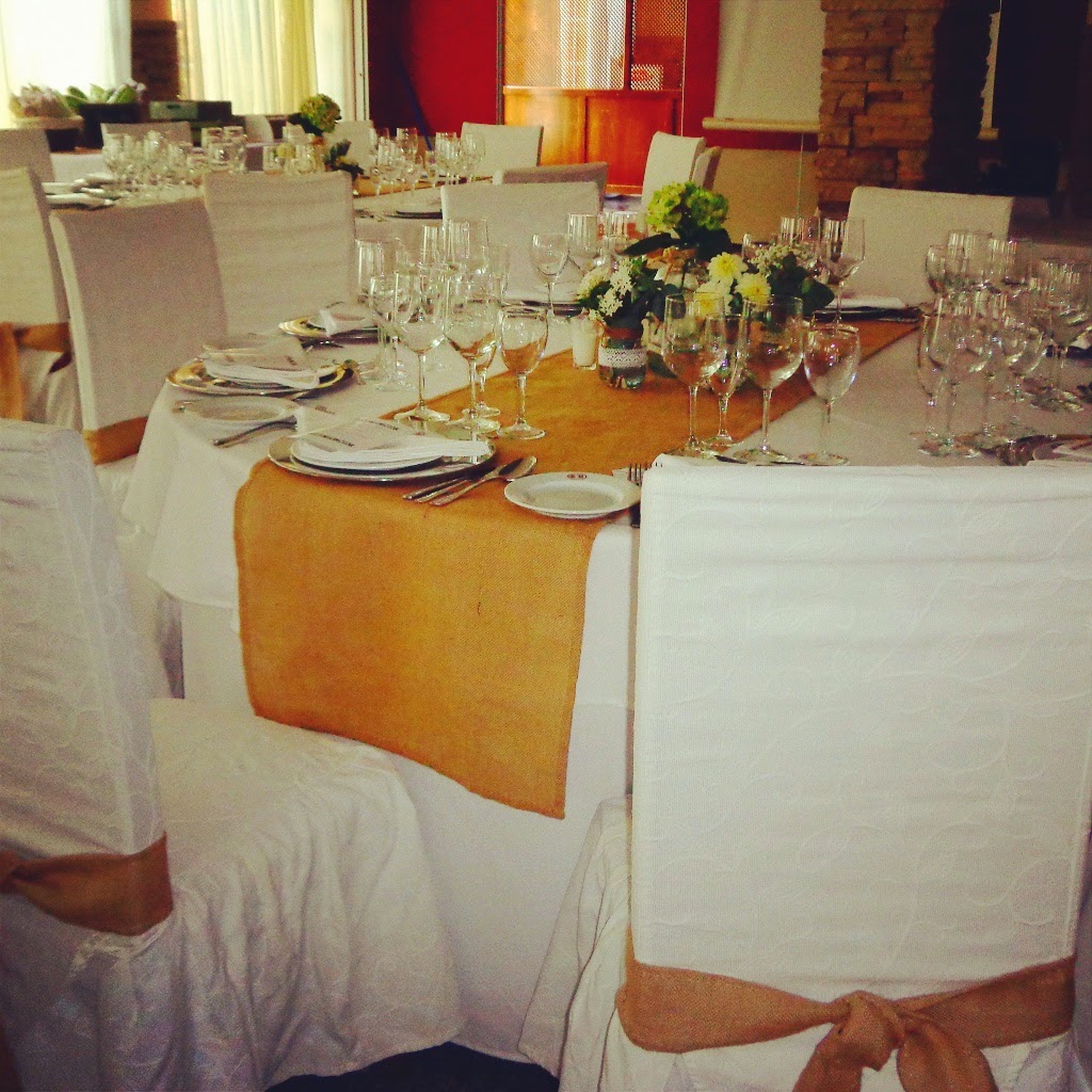 Rafia by NatireLas mesas y sillas del salón iban vestidas con mantel y fundas blancas. Para darle un toque rústico acorde con la decoración del cocktail y con las columnas de piedra que tenía el salón, confeccionamos unas tiras de tela arpillera para cada silla y unos caminos de mesa consiguiendo un efecto mucho más cálido