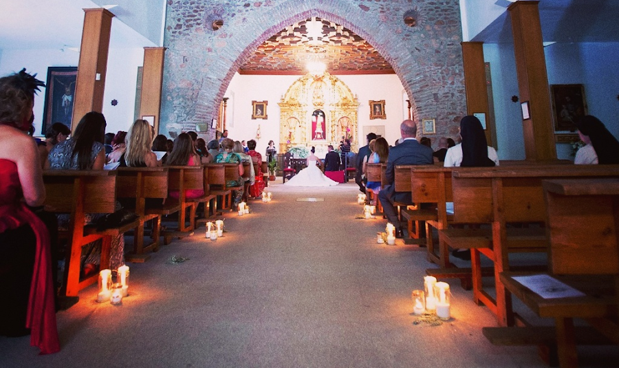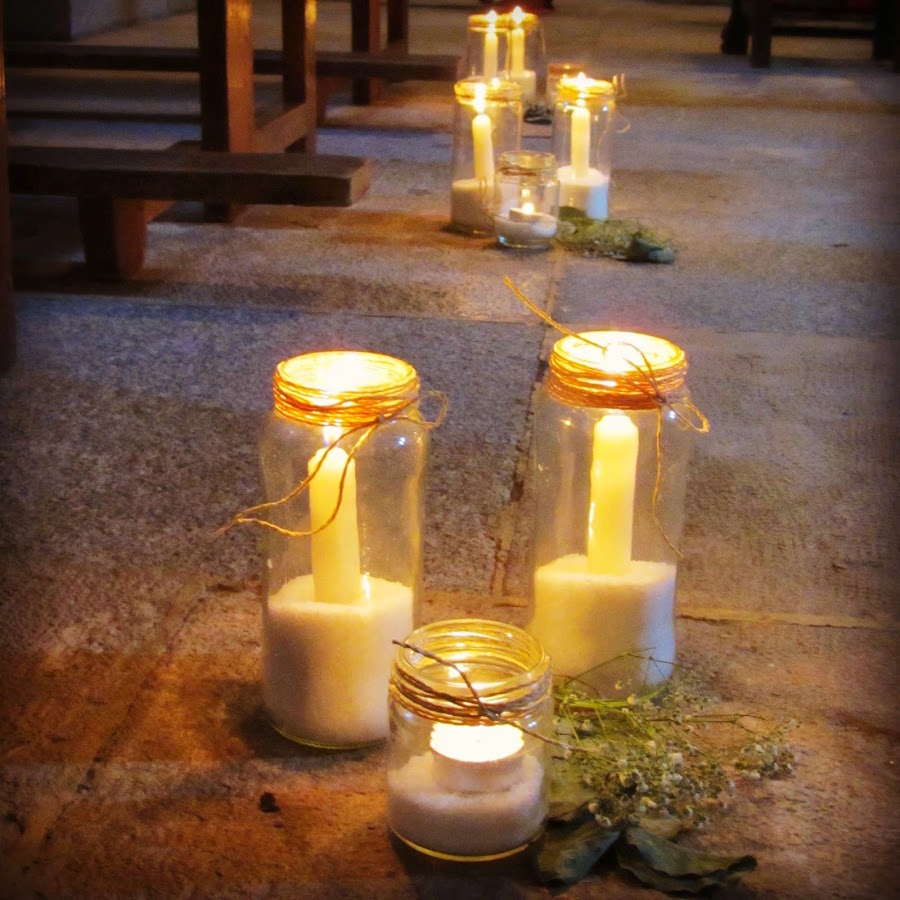 Ya en el interior de la ermita, colocamos en el suelo, a lo largo de todo el pasillo, un camino de velas con ramilletes de paniculata y eucalipto. Aunque en la fotografía no se aprecia, la entrada de la novia solamente con la luz que desprendían las velas (bajaron las luces de la ermita) y el coro de fondo, fue espectacular.