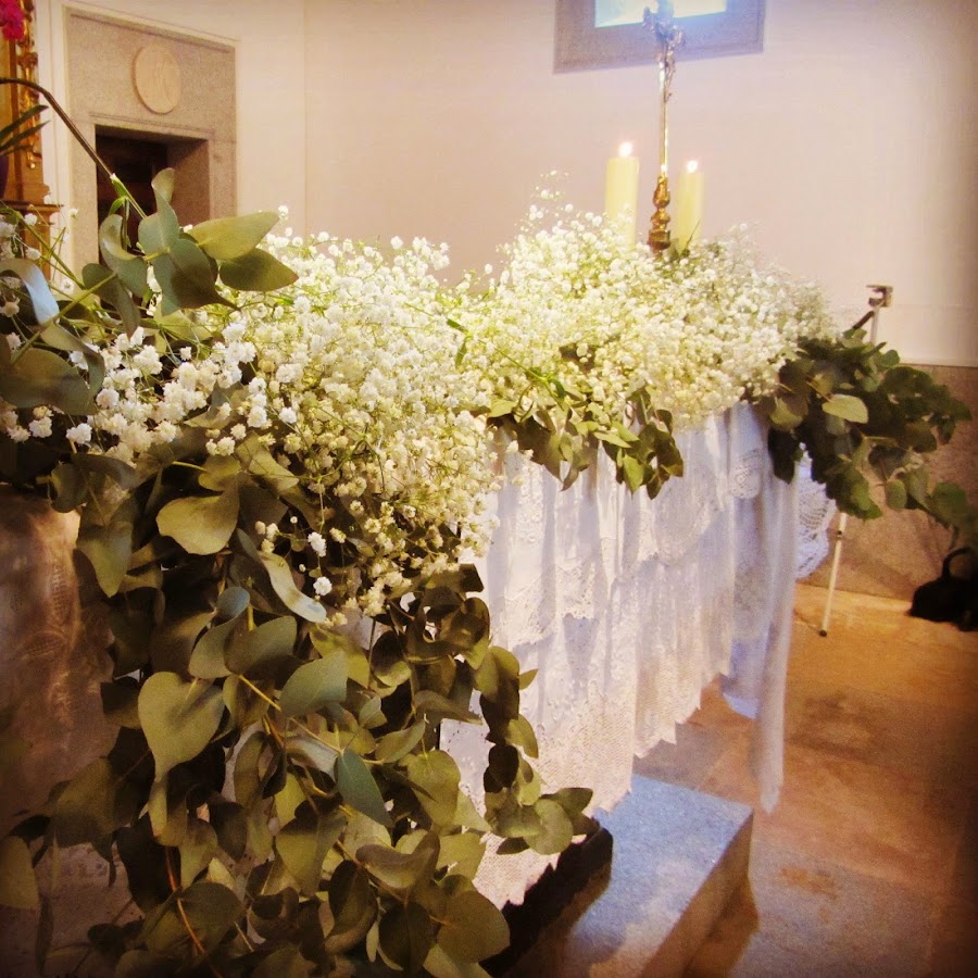 Para el altar, quisimos crear un ambiente campestre y sencillo a base de eucalipto y paniculata que sobresalía de forma natural por los extremos de la mesa