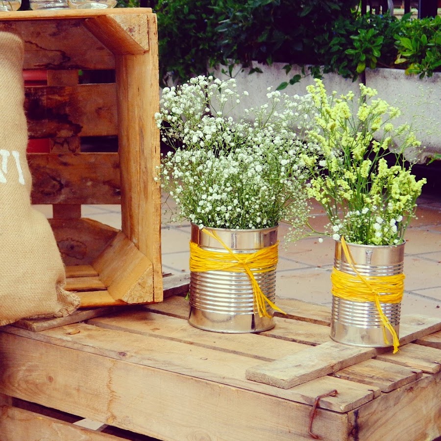 Otro de los detalles que pusimos en esta zona fue un pequeño montaje con nuestras ya habituales cajas de fruta antiguas donde colocamos tarritos de hojalata y frascos de cristal con flores. Además, quedó de maravilla en el montaje el cojín personalizado que les hicimos a los novios