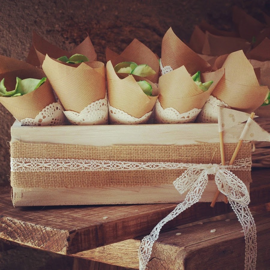Rafia by NatireLos novios quisieron tener un detalle con sus invitados y encargaron a una famosa pastelería de la zona los famosos y apetecibles "manolitos". Los colocamos en varias cajas de estilo vintage y mirar la pinta que lucían... Nos costó resistirnos!