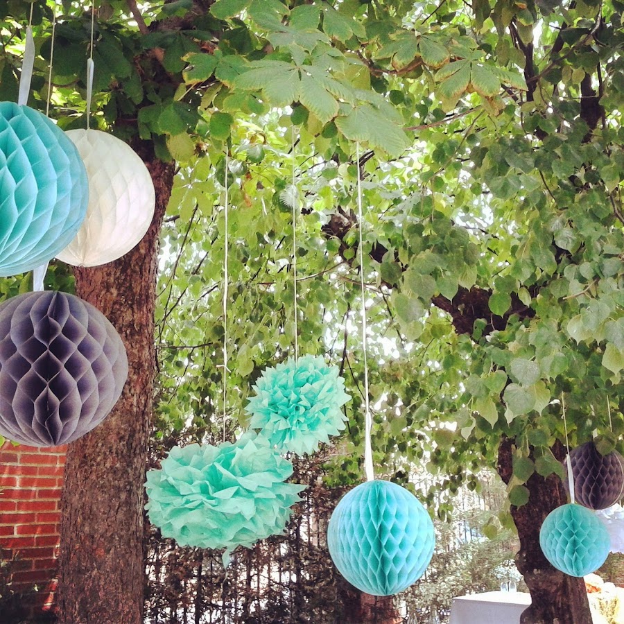 Bea quería decorar la zona del cocktail con muchos pompones que colgaran de los árboles, así que ideamos este rinconcito mezclando pompones de nido de abeja y seda en tonos mint, gris y beige colocados a diferentes alturas. Debajo de ellos pusimos nuestra mesa/puerta antigua con el árbol de los deseos y algún que otro detalle más