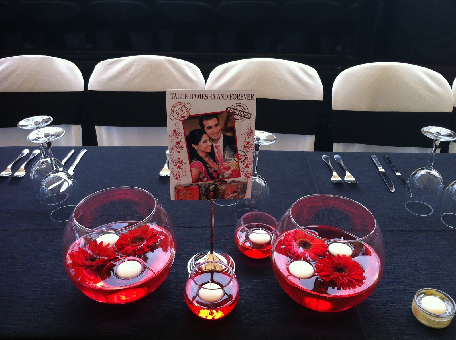 Los meseros eran fotos de los novios. Cada una de las mesas llevaba el nombre de cada una de las ciudades donde pasarían la luna de miel a excepción de la mesa presidencial que era una imagen de la pre boda de los novios.