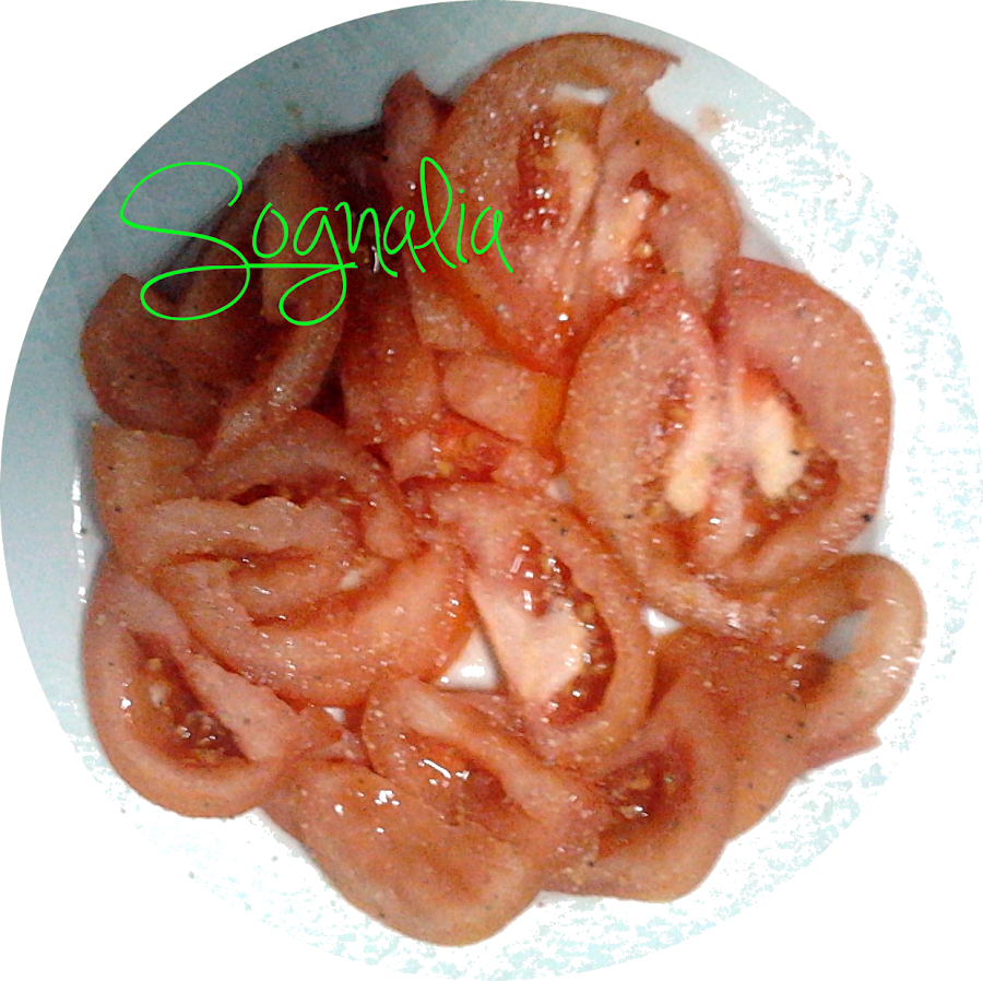 Sencillamente lavamos un tomate, lo laminamos, le añadimos sal, pimienta y orégano o albahaca. Ideal para un almuerzo ligerito acompañado de fruta.