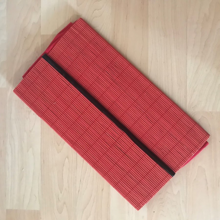 Se ha de pegar con silicona caliente al salvamanteles los rectángulos de cartón para componer las tres partes del bolso. El centímetro sobrante del salvamanteles D lo doblé hacia adentro encima de la parte A de cartón.