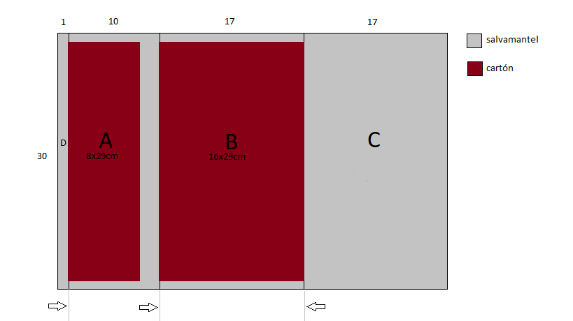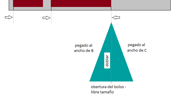 Las dos partes iguales de 17cm, B y C será el cuerpo del bolso: C irá sobre B y la parte de 10cm A será la solapa e irá sobre el cuerpo B y C.