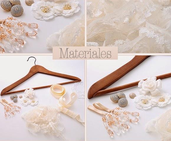 Lo bueno de este DIY es que cambiando los materiales podéis hacer la percha del vestido de novia propiamente dicha, la del novio, una percha regalo para una amiga o simplemente para decorar las que usáis para vuestra ropa de diario. Como vamos a ver a continuación, los materiales que se necesitan no pueden ser más fáciles de encontrar: