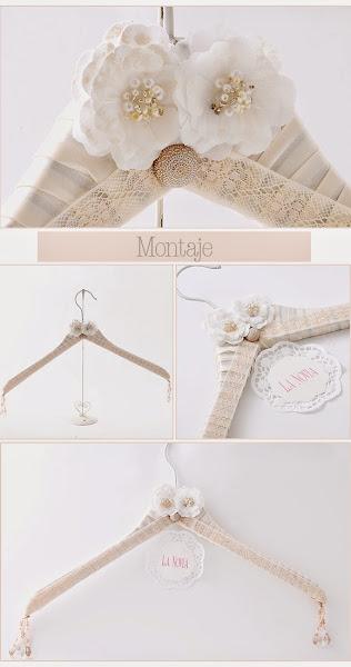 Para la etiqueta cortaremos el nombre en cuestión, en este caso "la novia" y lo pegaremos en la parte central de la blonda. Solo nos queda introducir un alambre muy fino por las ranuras de la blonda y engancharlo al centro de la percha.... y ¡Voilá! Nuestra percha ha quedado de lo más cuca y ya está lista para portar el vestido de nuestro día B :)