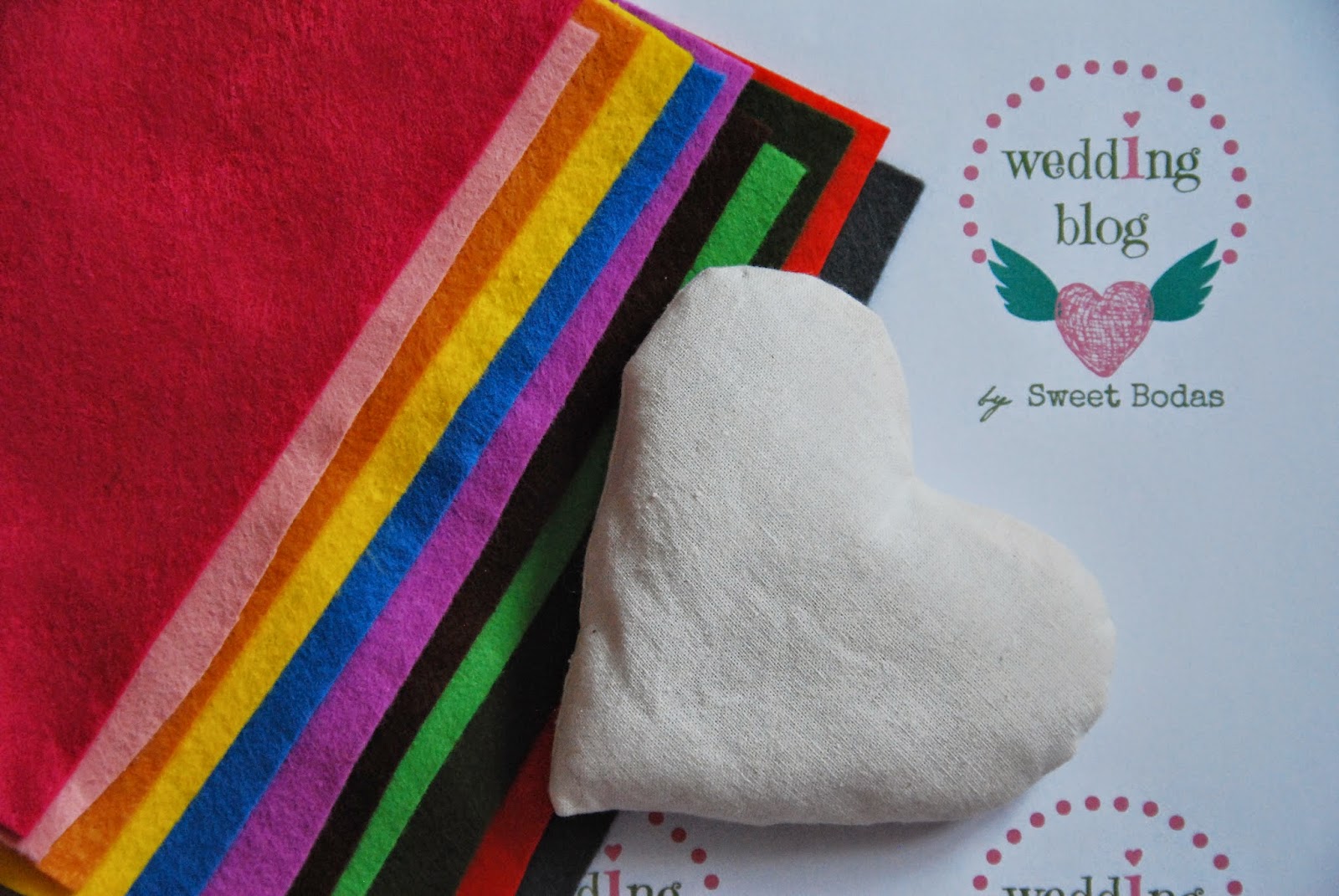 Como sabéis, suelo usar mucho fieltro en los tutoriales así que tengo prácticamente de todos los colores. En este caso, he escogido una especie de rosa fucsia, otro rosa más bebé, mostaza y dos verdes distintos, pero podéis escoger los que más os gusten o de las tonalidades que hayáis elegido para vuestra boda.