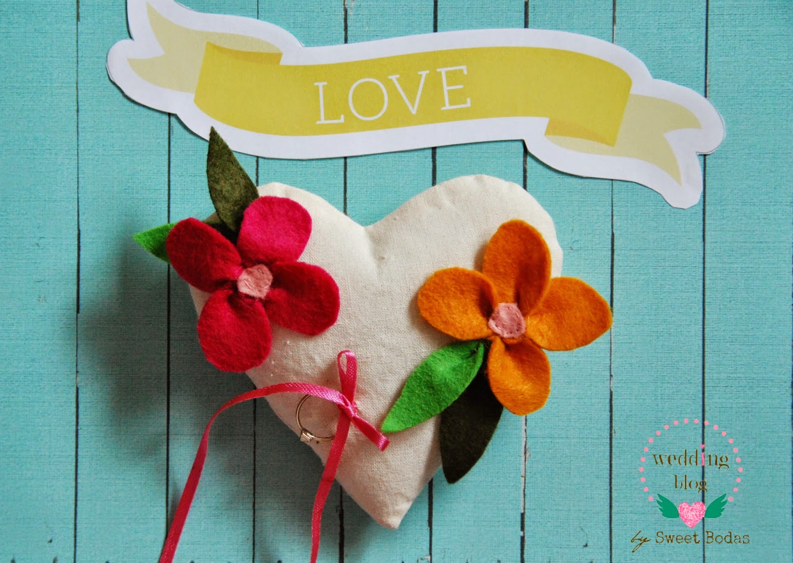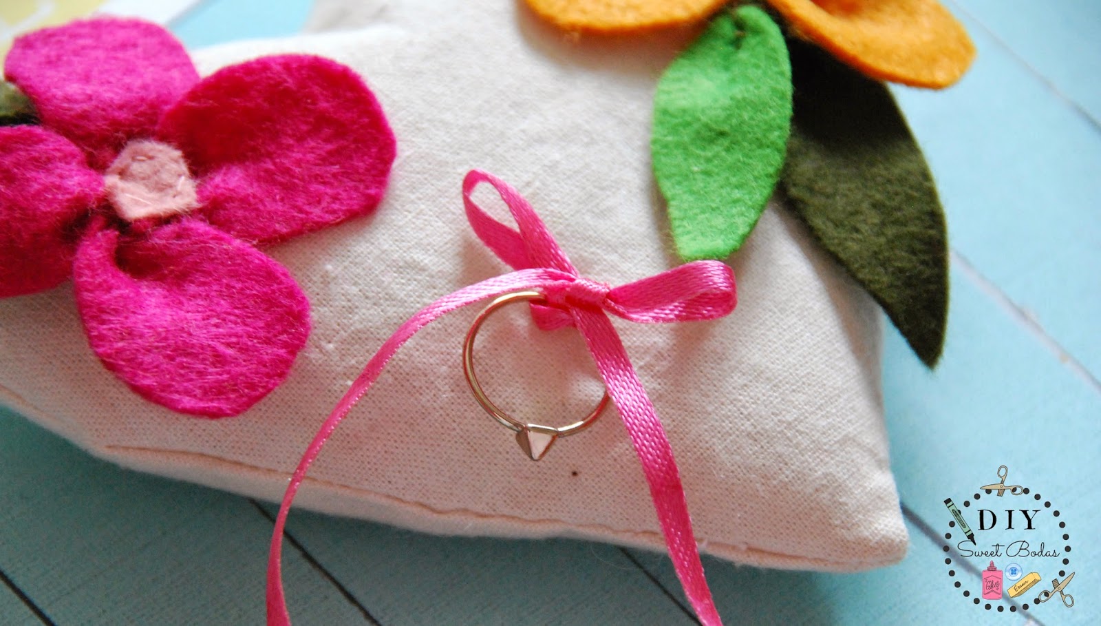 Después, hacemos un pequeño lazo con una cintay lo cosemos al cojín por el nudo. Y? ¡voilá! Ya tenemos listo un precioso porta alianzas hecho con nuestras manitas.