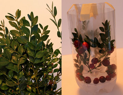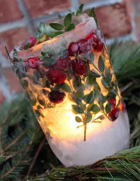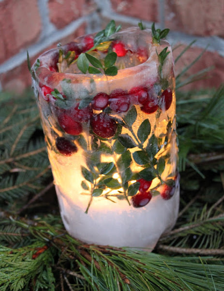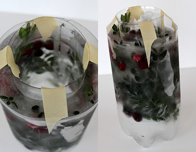 Se trata de unos portavelas, hecho con hielo, hojas y frutos.