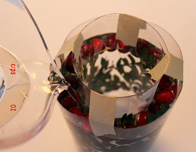 Vertemos agua donde hemos puesto las hojas y los arándanos, dejando un dedo para que no se nos salga el agua al congelarse.
