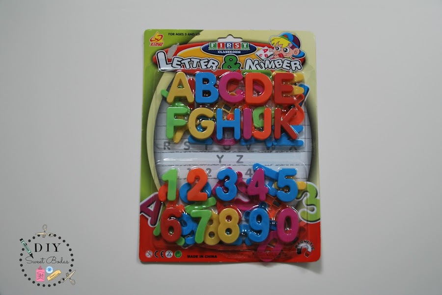 ¿Cómo hacerlo? ¡Vamos al lío! Se necesitan unas letras con imanes que podéis encontrar en cualquier juguetería o también en los chinos y un spray metalizado en color dorado (o al gusto).