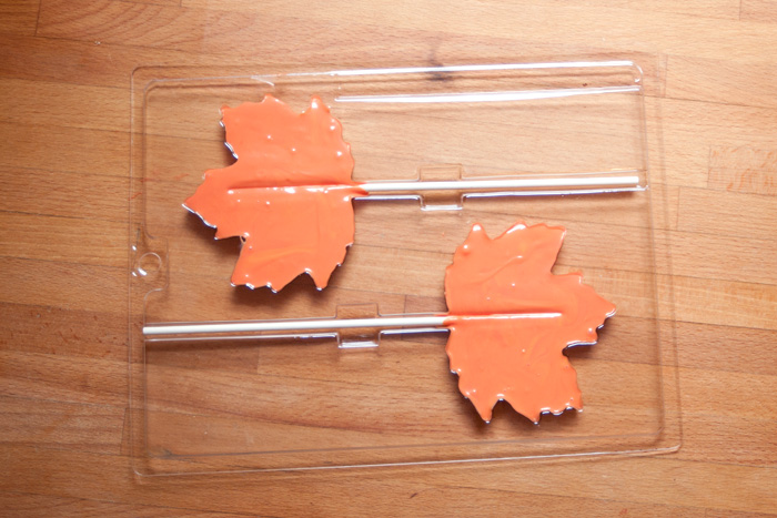 Una vez derretidos los pondremos en los moldes junto con el palito de madera, nos tenemos que asegurar que el palo este totalmente cubierto, así nos aseguraremos que aguantará el peso del chocolate.