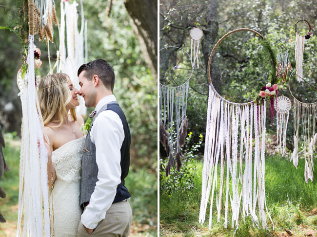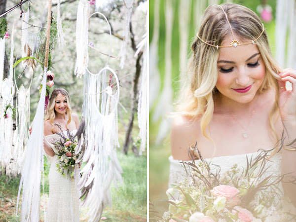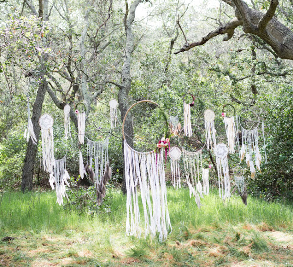 Pues bien, en las bodas estilo boho se han convertido en el artículo estrella de la decoración y se puede hacer un altar precioso a base de atrapasueños y aros decorados con flores y flecos cayendo de los árboles. A mi me parece una idea genial y diferente.