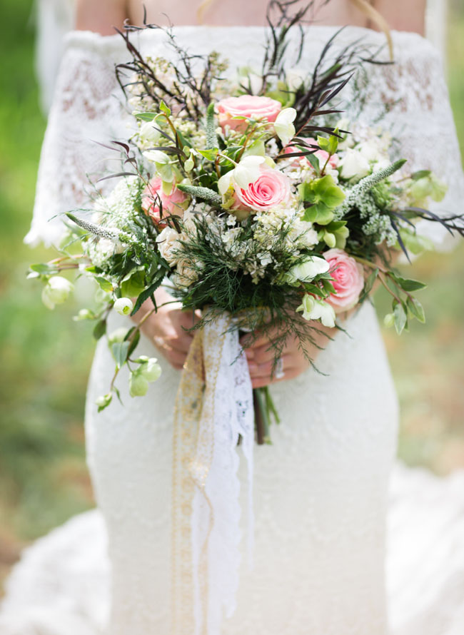 Si vas a ser una novia boho elige un vestido con un toque hippies chic de encaje con un cuello similar al que luce ésta novia, tiaras de flores, velos pirata, ramos enormes a juego con el resto de flores. La verdad es que cada día me gusta más este tipo de estilismo ¿y a vosotras?.