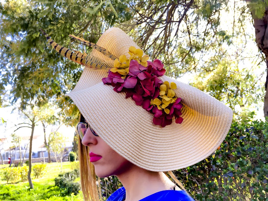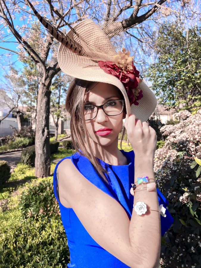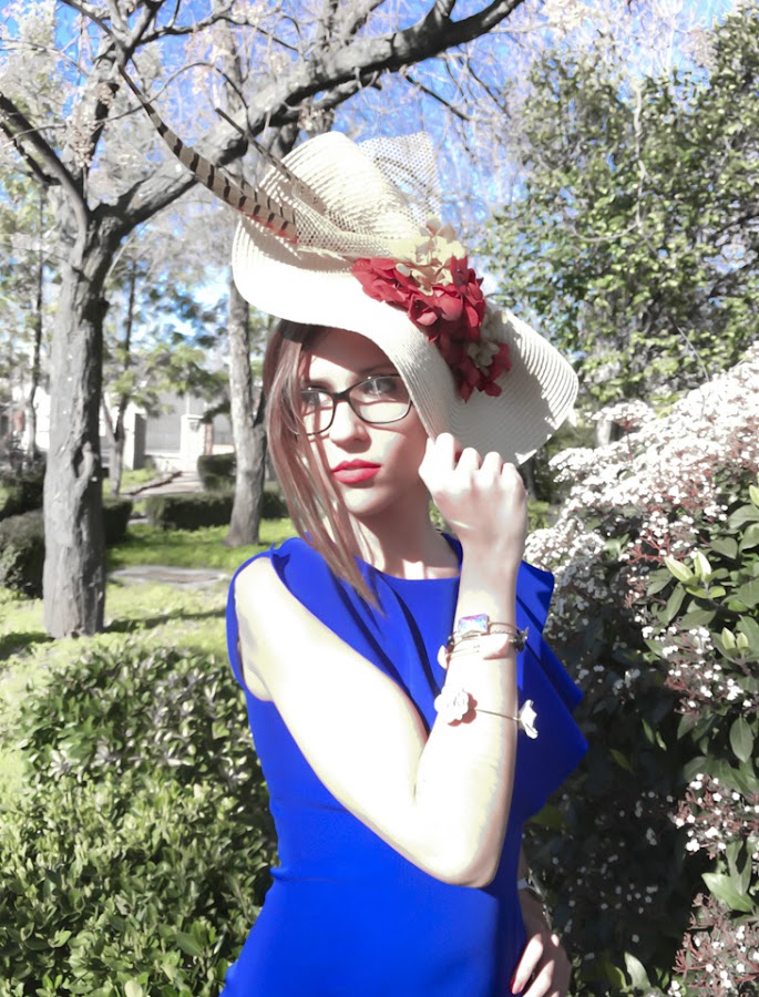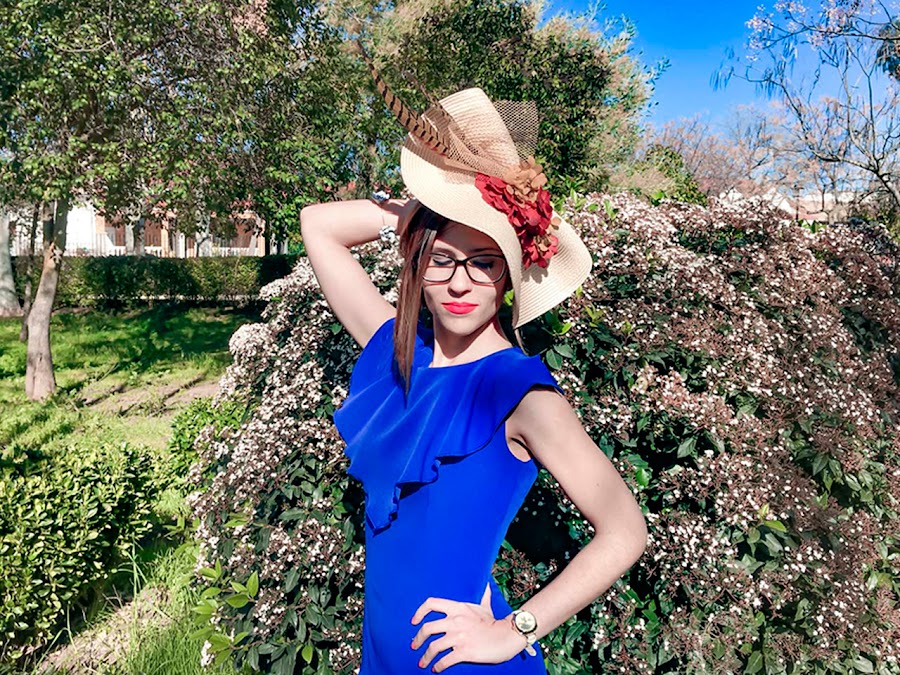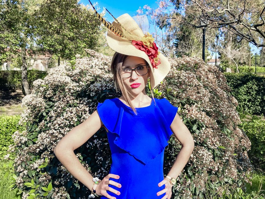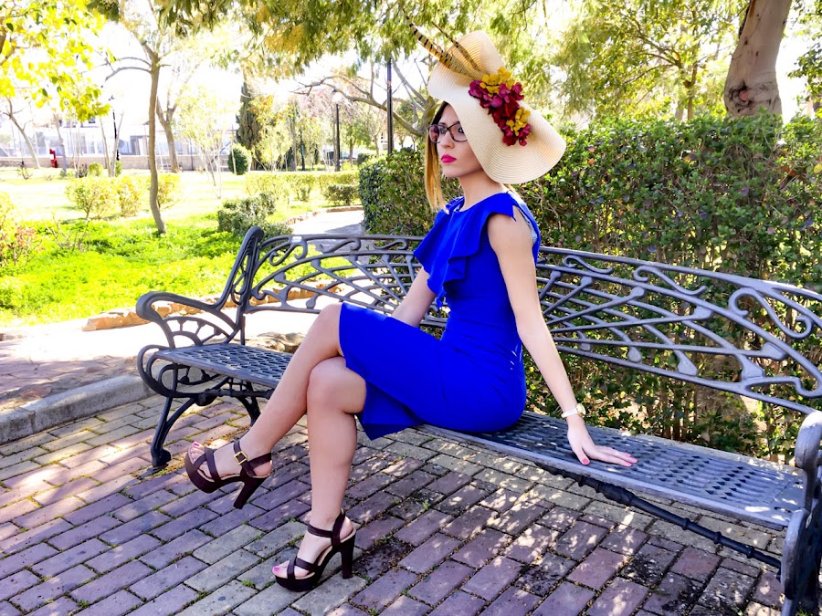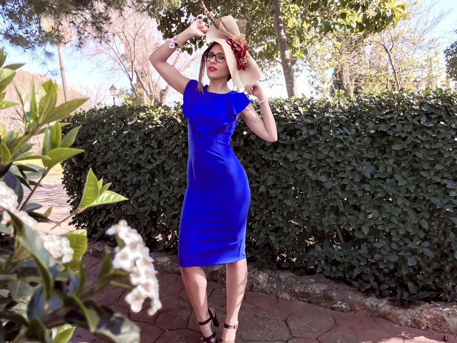 Si algo destaca en el look de hoy es la elegancia y sencillez de este vestido midi azul klein (color que me encanta), sienta genial y se adapta como un guante. Además, tiene un detalle de volante en el pecho que hace que destaque aún más. Lo he acompañado de un tocado en forma de medio sombrero adornado con flores y plumas.