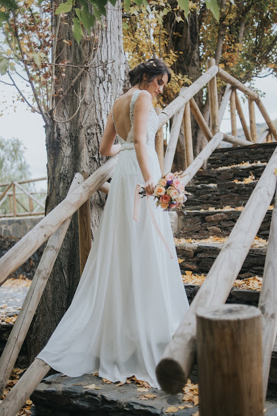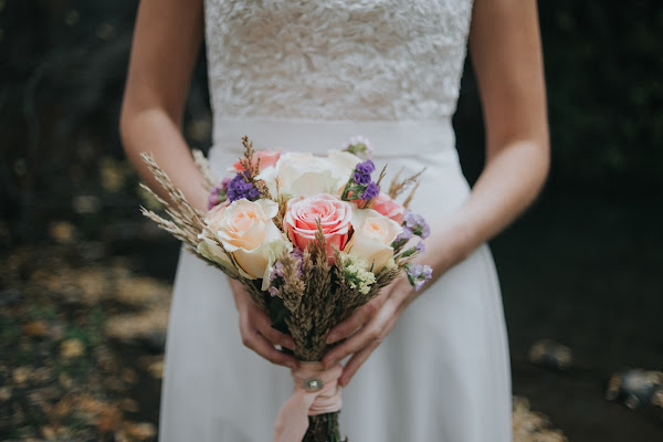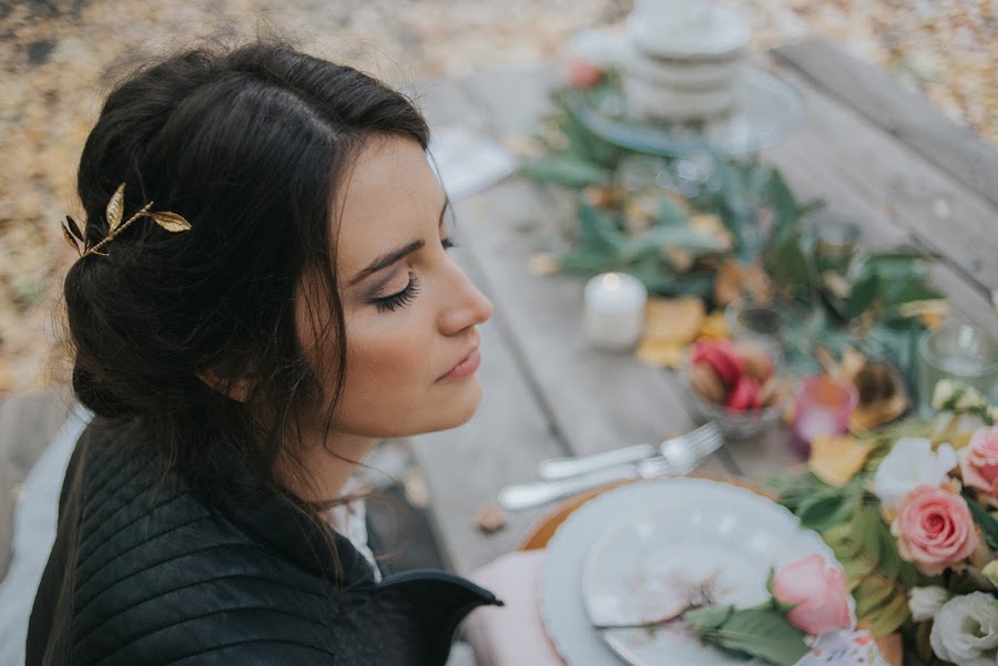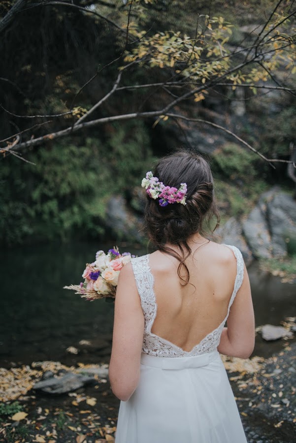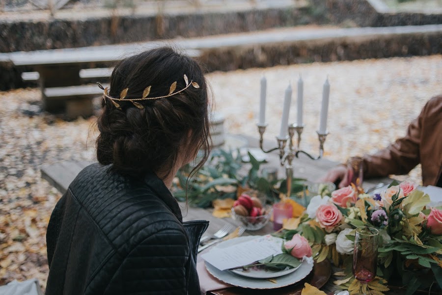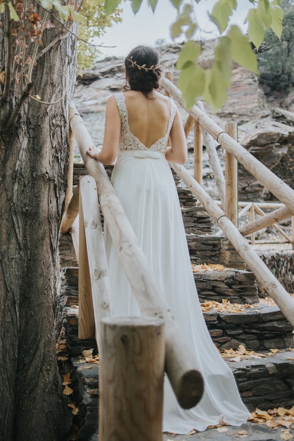María, de Capri Peluqueros captó a la perfección la idea y le hizo a la novia un recogido bajo desenfadado que en este caso combinamos primero con flores naturales, y después con una diadema de hojas doradas.
