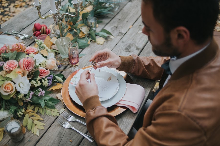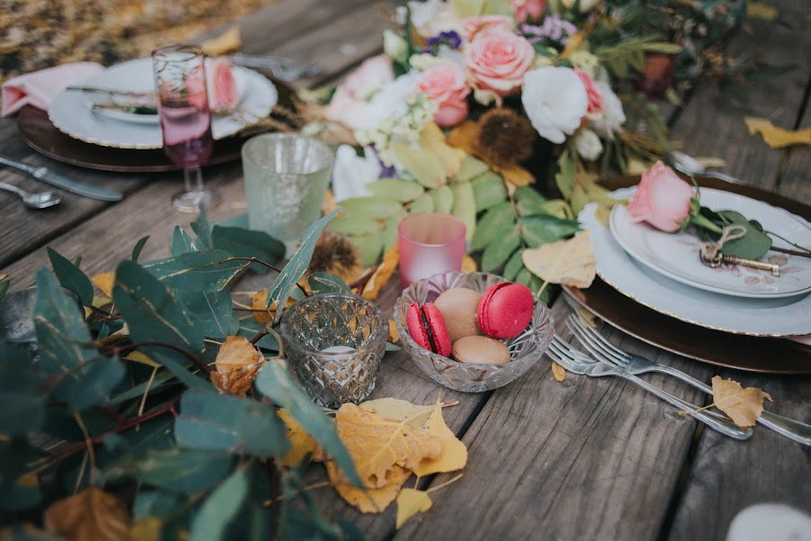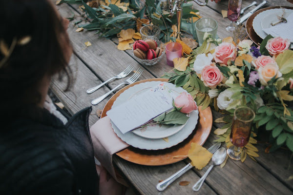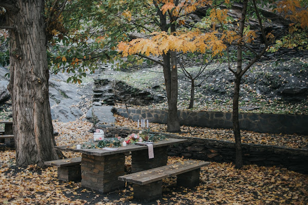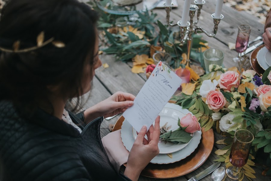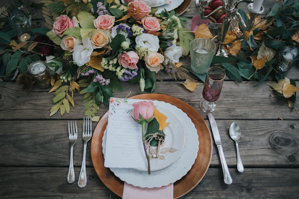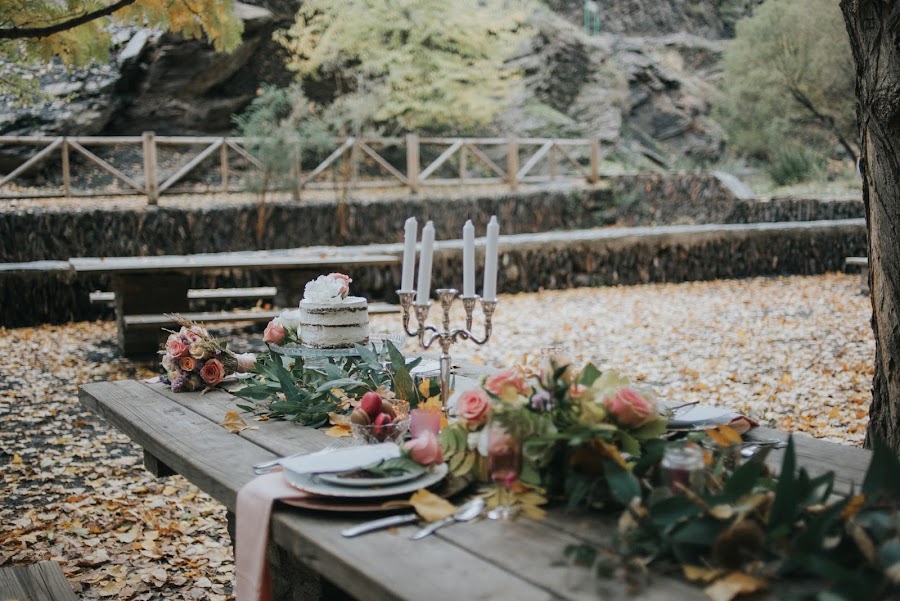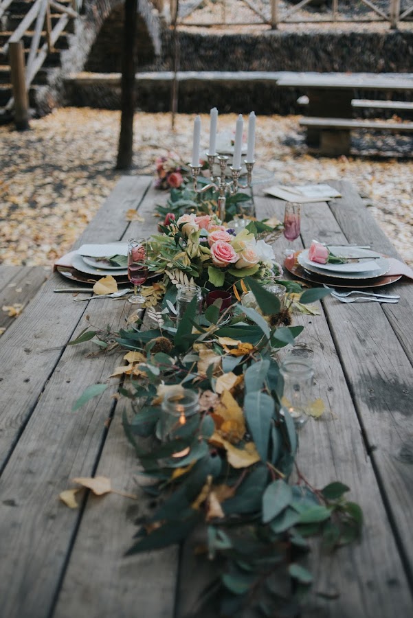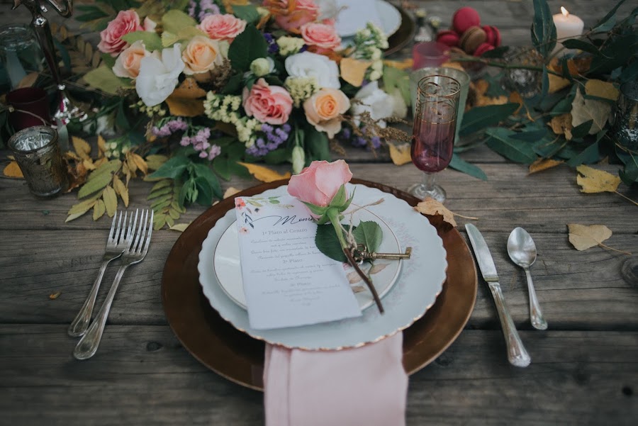 En la zona exterior a la cascada, montamos una mesa nupcial decorada con eucalipto, rosas, velas, hojas secas, acompañada de una vajilla con un toque vintage, y el menú impreso sobre papel de algodón hecho a mano, tan dulce como un invierno decorado en tonos pastel.