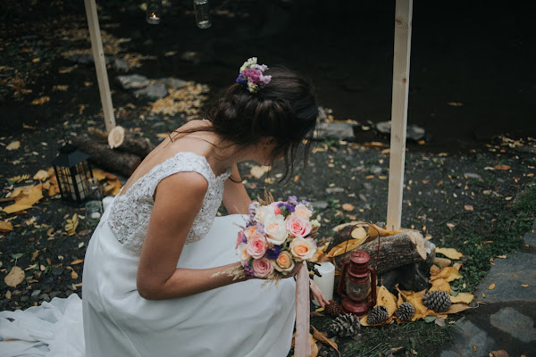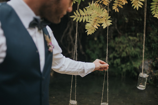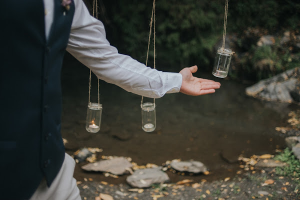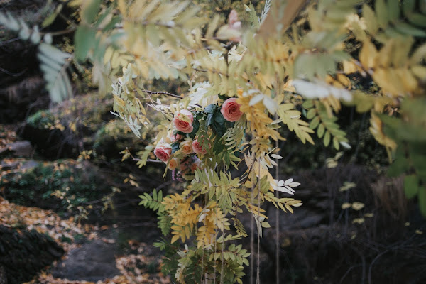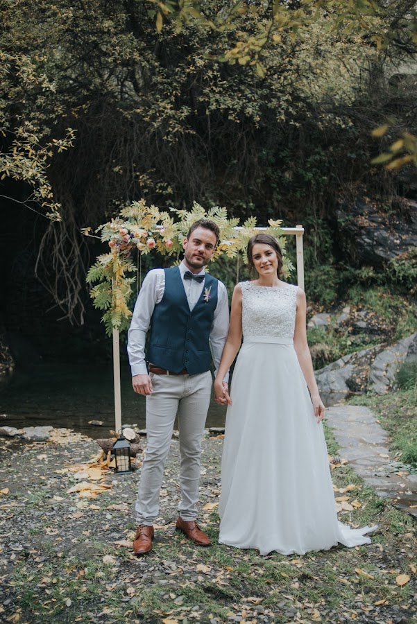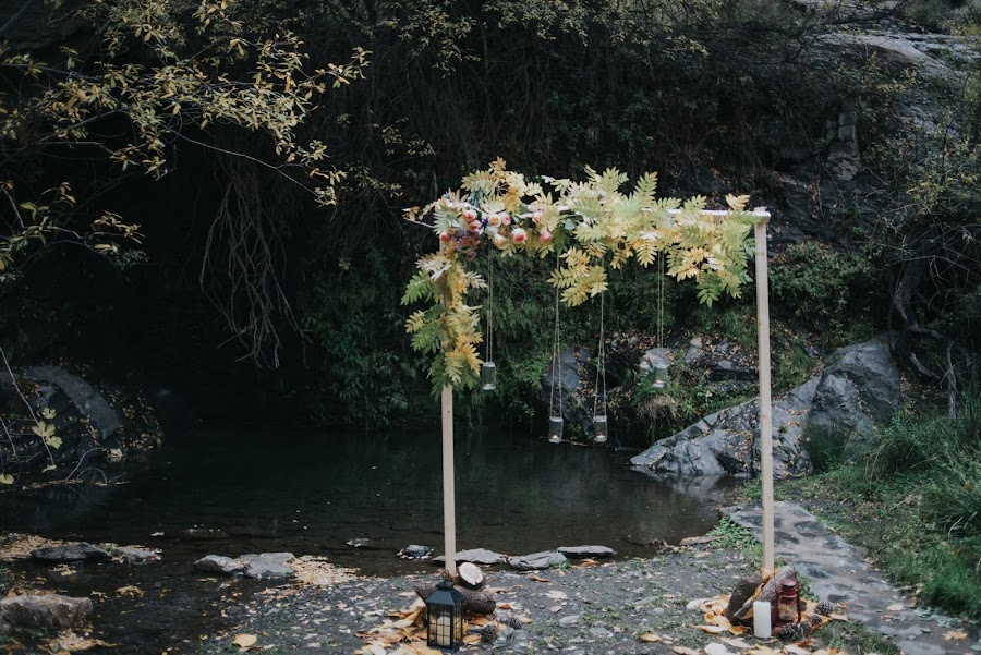 Situado en un entorno singular como es el Río Chico de Ohanes, preparamos dos espacios diferentes. Una zona de ceremonia delante de la cascada compuesta por un altar de madera, vestido con rosas en tonos champán y rosita claro, lisianthus blancos, siemprevivas de diferentes colores y ramitas con hojas verdes y amarillas, con unos tarritos con velas.