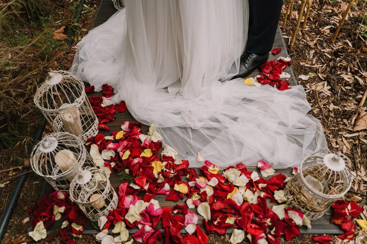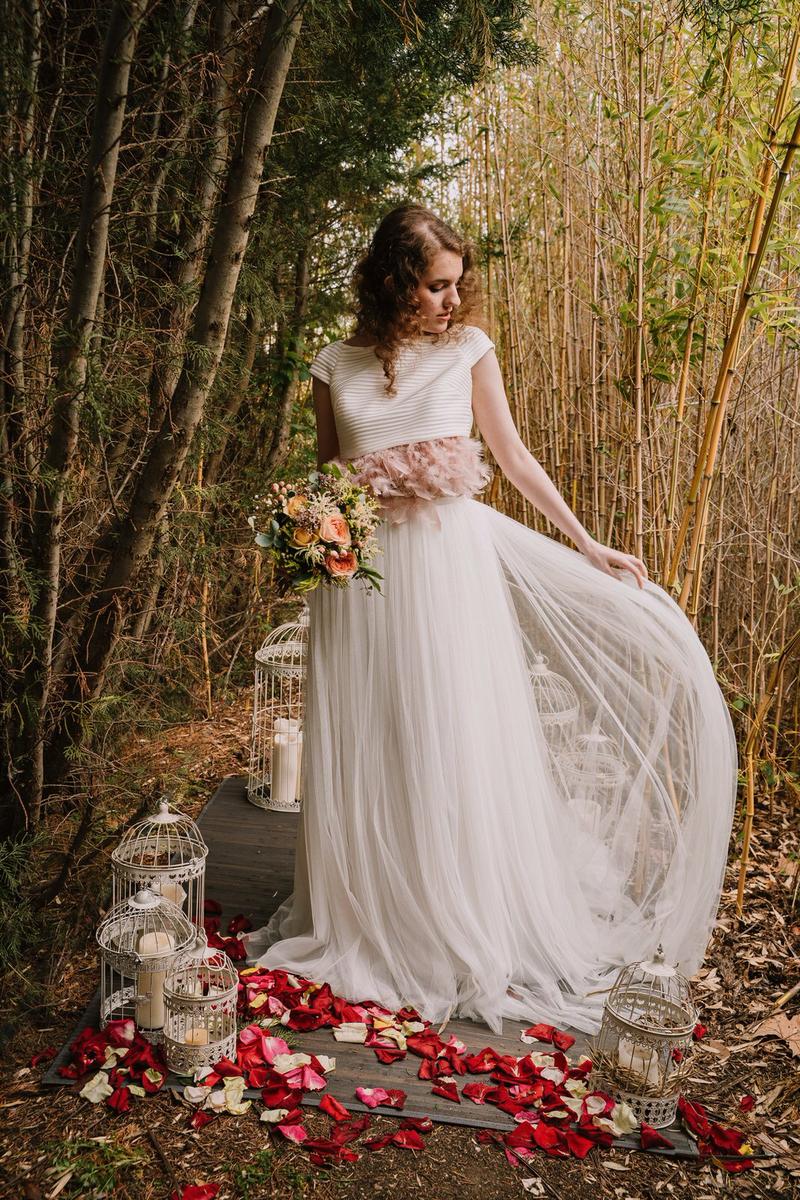 El estilo shabby chic es un estilo de decoración inspirado en lo viejo, en lo campestre. Es un estilo sofisticado y elegante y que cada vez esta mas de moda en las decoraciones de bodas. En esta ocasión podemos ver a los novios disfrutando de su amor, en un pequeño rinconcito escondido en un bosque de bambú, rodeado de pétalos de flores, siendo los únicos testigos los pájaros y la luz de la mañana.