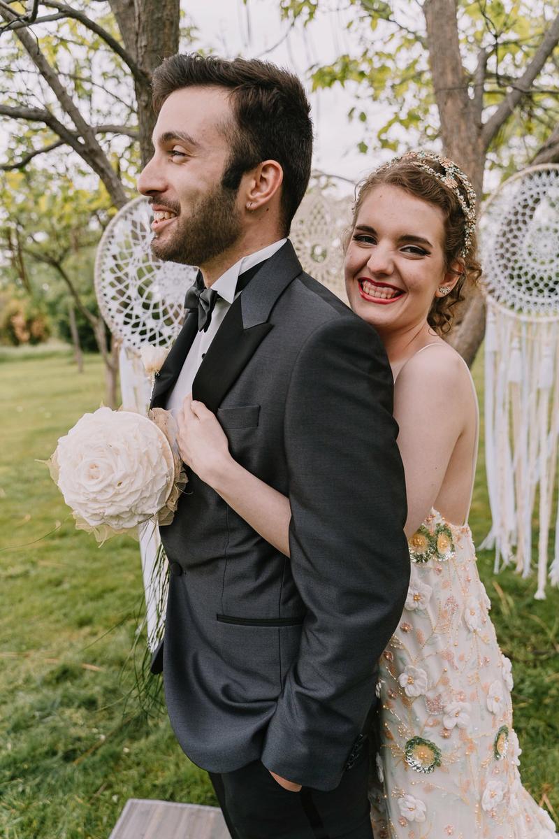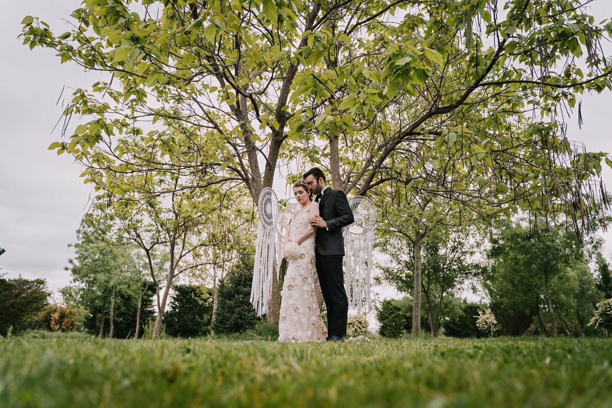 Las bodas indies se han convertido en todo un referente eco friendly y de boda sostenible. Volvemos a tener los atrapasueños pero esta vez mucho más grandes para darle un toque mucho mas significativo. Se junta con el estilo retro para tener un espacio singular. Espectacular el mono con capa y el ramo cadena con flores preservadas y plumas, una opción muy original