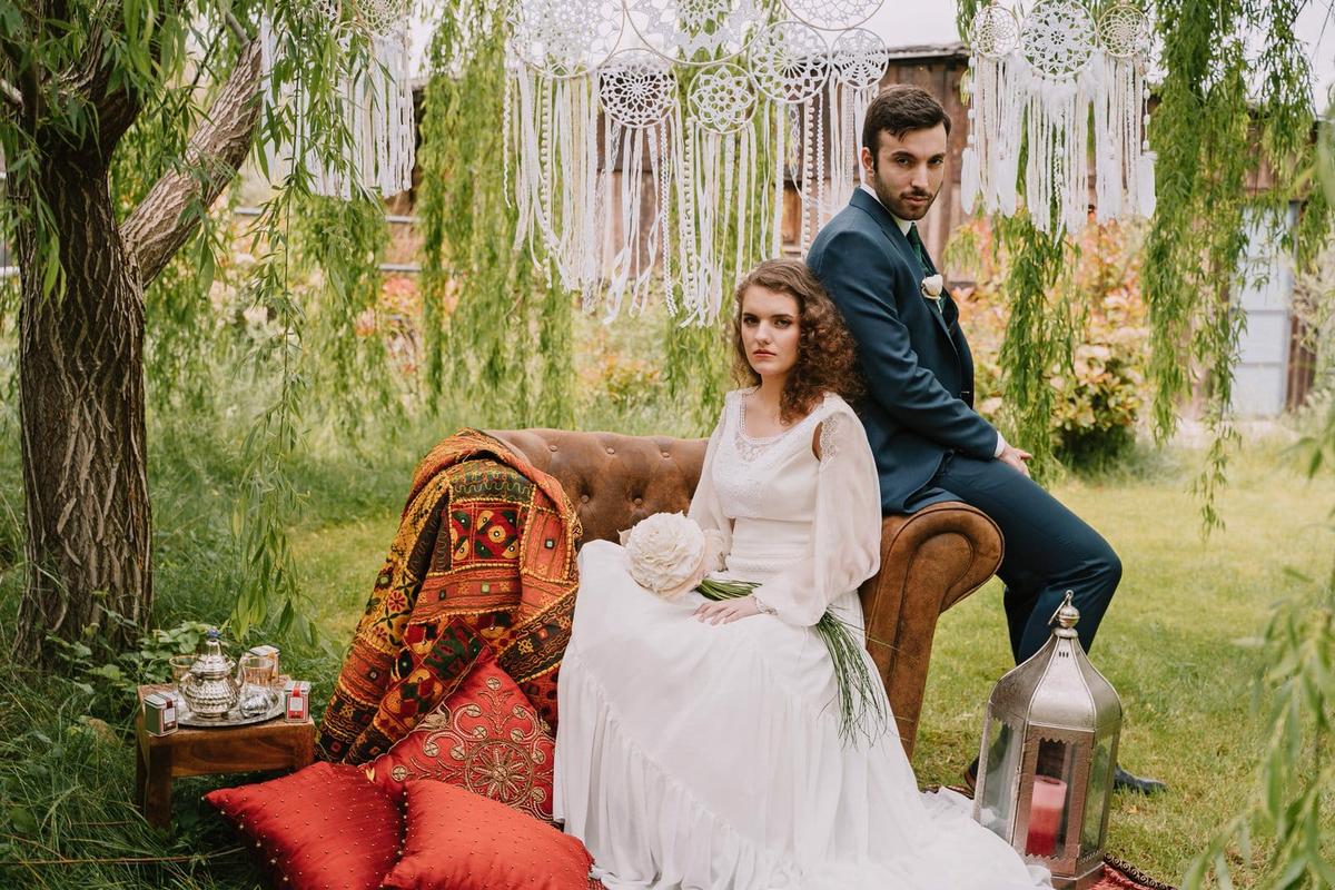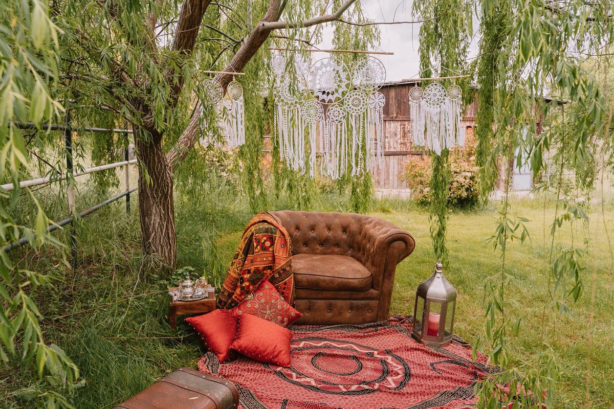 La tendencia boho es sinónimo de relajación, bien sea en la vestimenta o en la decoración son las bodas relajadas y pausadas, donde lo importante es que se disfrute al máximo del evento. La pareja esta disfrutando de un té en un sofá mientras conversa.  Un detalle que cobra especial importancia son los atrapasueños de Gaia Boho Deco dando al escenario un toque único y elegante.