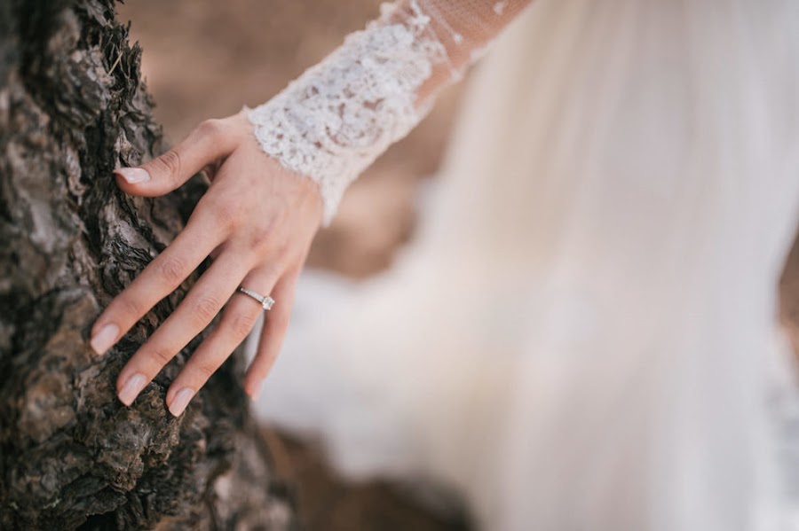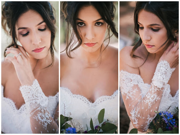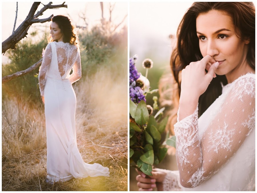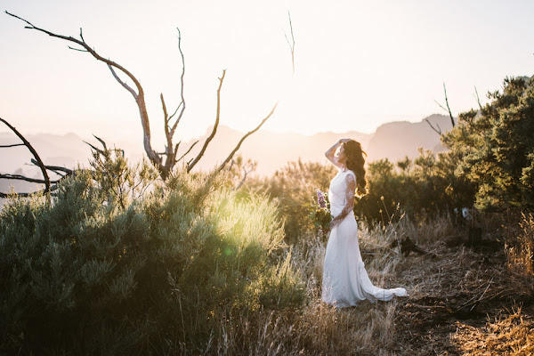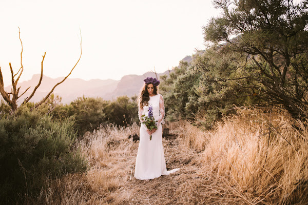 Para el último set, nos adentramos en plena naturaleza y esperamos a que cayera la tarde. De fondo, un paisaje montañoso donde incluso se podía vislumbrar con nitidez El Teide en la isla de Tenerife. Último cambio de vestuario y mi modelo favorito, el DAC un impresionante y romático vestido georgette con detalles en chantilly y pedrería con el que Marta lucía absolutamente espectacular y que comletó con melena suelta marcada con ondas suaves y diadema modelo Frida en tono violeta de Musak Tocados a juego con el ramo.