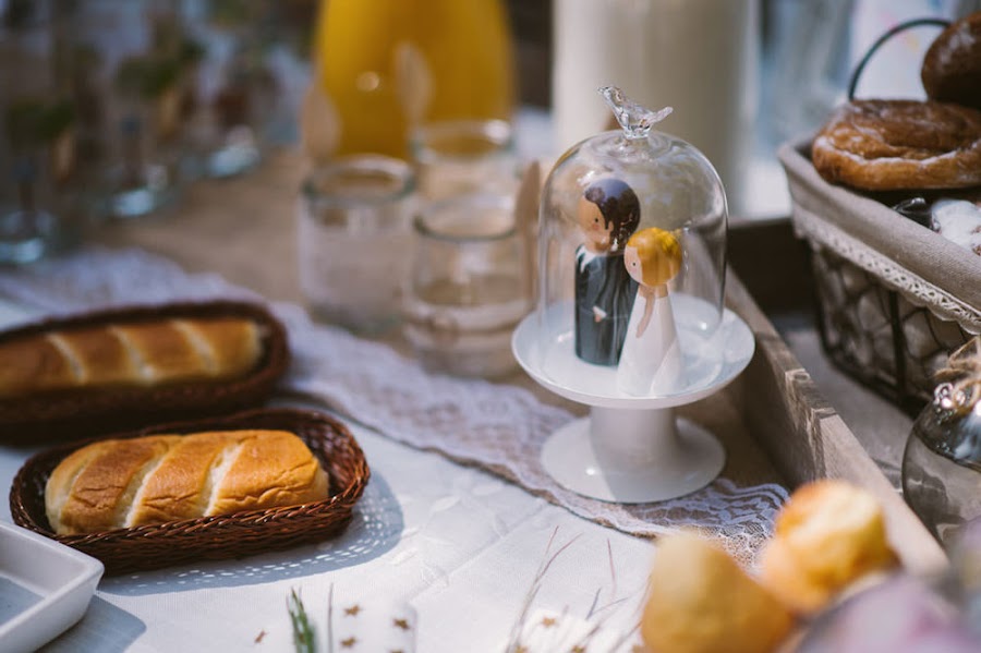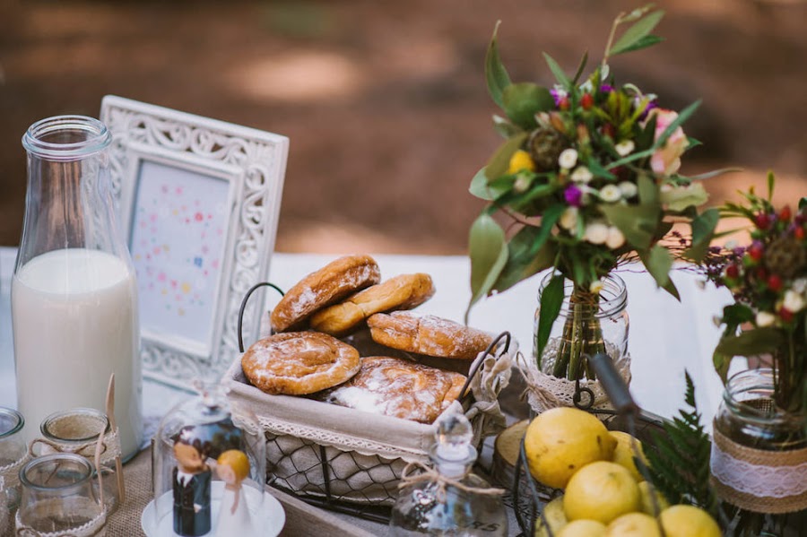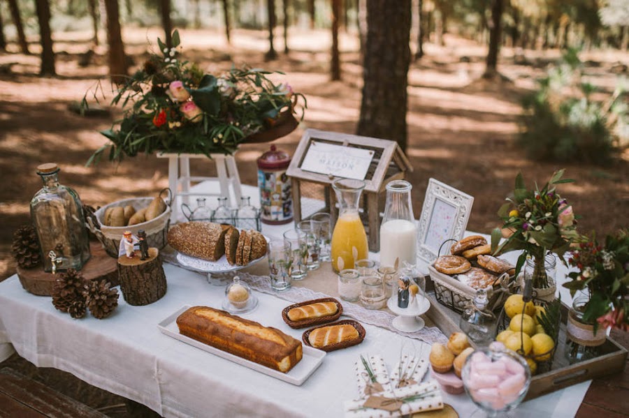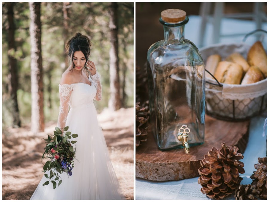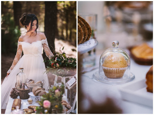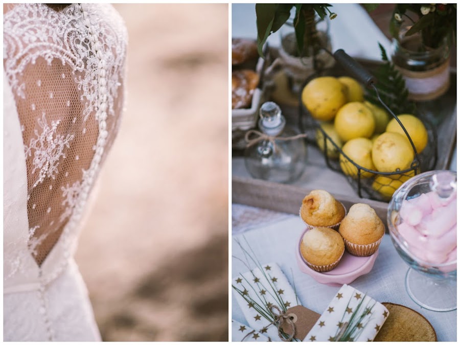 El primer set se desarrolló en los Llanos de Ana López donde me encargué de montar una mesa diferente. Lejos de las tradicionales mesas dulces, quise darle un toque otoñal organizando una auténtica merienda al aire libre a base de bizcochos o queques como los llamamos en Canarias, magdalenas, bollitos y ensaimadas, acompañada de preciosos bouquets silvestres a cargo de la floristería El Arriate. Para la ocasión, Marta lucía el modelo DOMINIC con cuerpo de encaje rebrodé y chantilly, pedrería y falda de tul. El pelo, un recogido de aire desenfadado creado por Jared Pascual quien maquilló y peinó a Marta en todos sus estilismos, Como broche final, una semi corona de hojas doradas confeccionada por Musak Tocados.