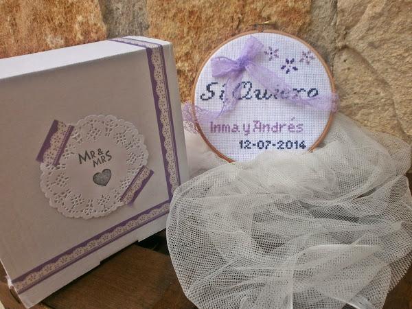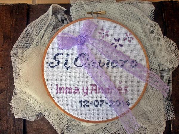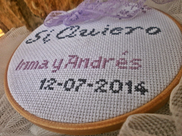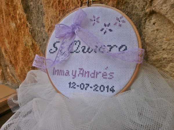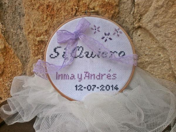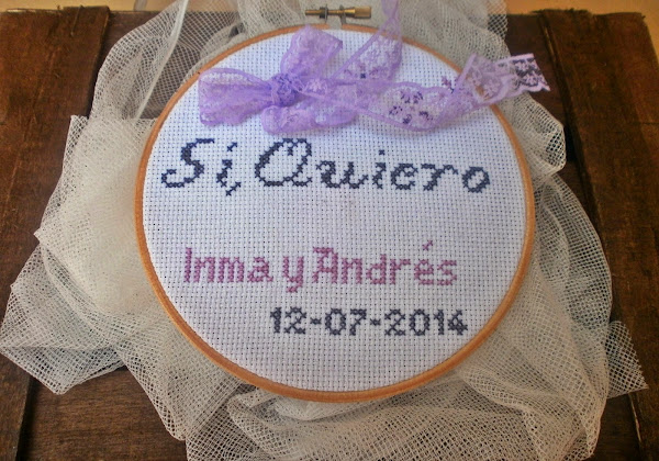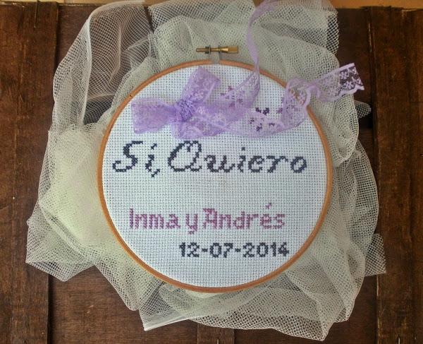 Ya hace un tiempo Marieta en su blog hizo un sorteo de un bastidor porta alianzas confeccionado en punto de cruz y quedé prendada de él, me gustó la dulzura del diseño, lo bien terminado que se veía, y para mí me dije: a ver cuando tengo unos novios que quieran llevar sus alianzas en un bastidor; y llegaron Inma y Andrés y nada más decirme que querían un bastidor supe que Marieta iba a ser la encargada de prepararlo.
