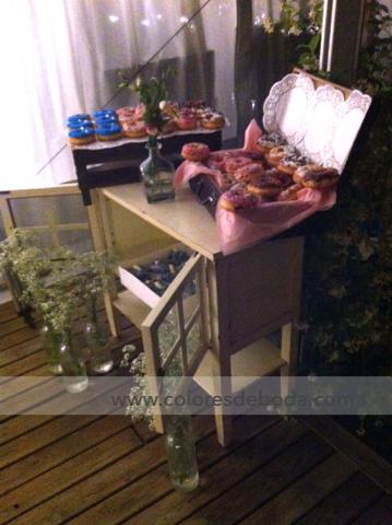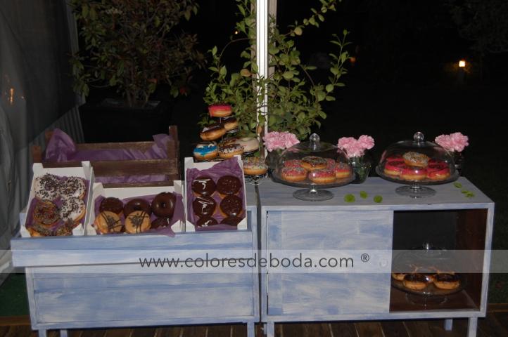 Ya sabéis que durante un tiempo fuimos súper fans de las donuts bar y las hemos puesto en muchísimas bodas. Utilizando cúpulas de cristal, cajas pequeñas de madera, expositores de tartas de cerámica o cualquier otra cosa en la que primara lo visual de las torres de donuts y se pudieran ver bien los colores o sabores elegidos por los novios para endulzar la barra libre. Os dejo algún ejemplo de archivo.