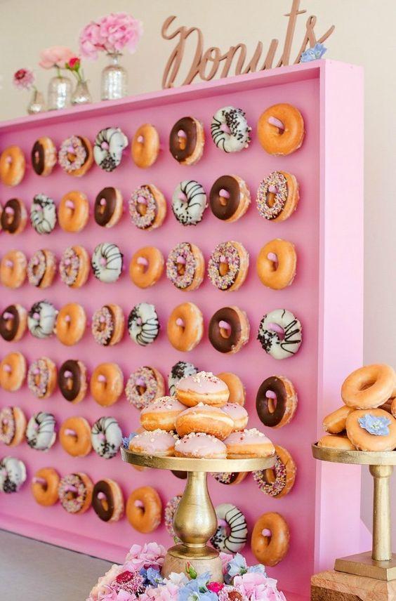 Pues como en todo, las modas vuelven y últimamente estamos viendo otra vez los buffets de donuts, esta vez en expositores verticales. Y la verdad es que adornados con flores o algún tipo de atrezzo en los lados del panel, lo veo súper bonito. Y si además los donuts van colocados de forma individual o como mucho, de dos en dos, mejor que mejor. Es cierto que los montajes en que los donuts van haciendo una torre o una pirámide quedan súper bien, pero en días de calor es poco aconsejable. Los donuts se pegarán unos a otros y lo veo un pelín asquerosete jajaja. Pero bueno, para gustos los colores y ahí estáis vosotras para decir cómo os gustaría que lo hiciésemos.