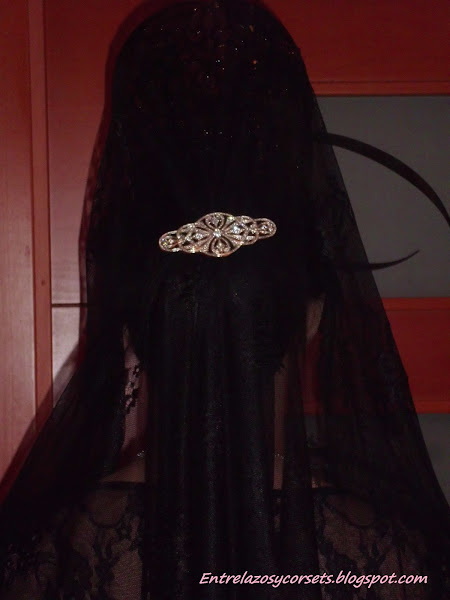 Mantilla negra de blonda, tul o chantilly. El largo de esta debe pasar por el bajo del vestido o superarlo.