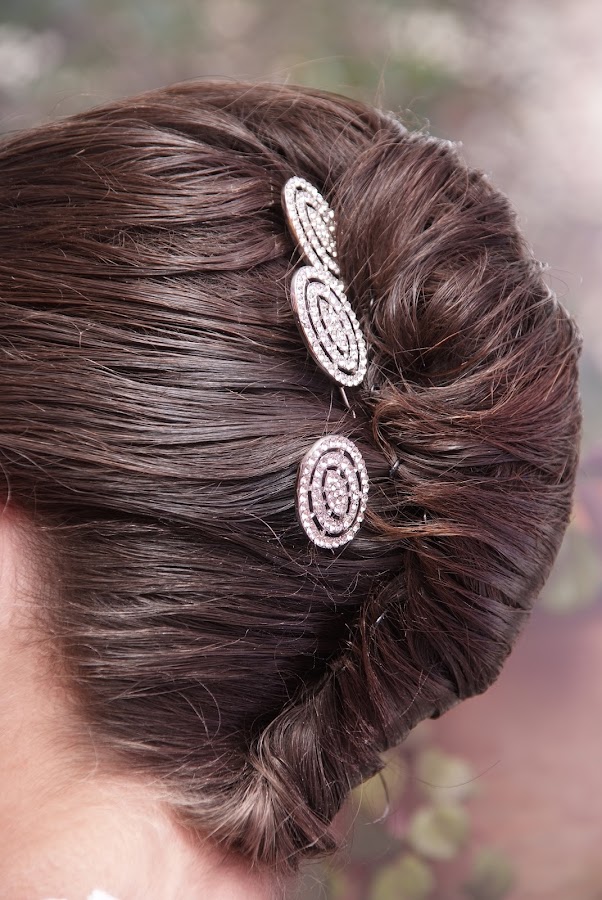 El peinado, un recogido a lo Audrey Hepburn, fiel a mi día a día, que tiendo siempre a llevar cola alta o recogido rápido. Los detalles son de EL TOCADOR DE LA NOVIA, os invito a que las futuras novias os acerquéis a esta tienda ya que tiene muchas alternativas en complementos y algún que otro vestido interesante estilo vintage.