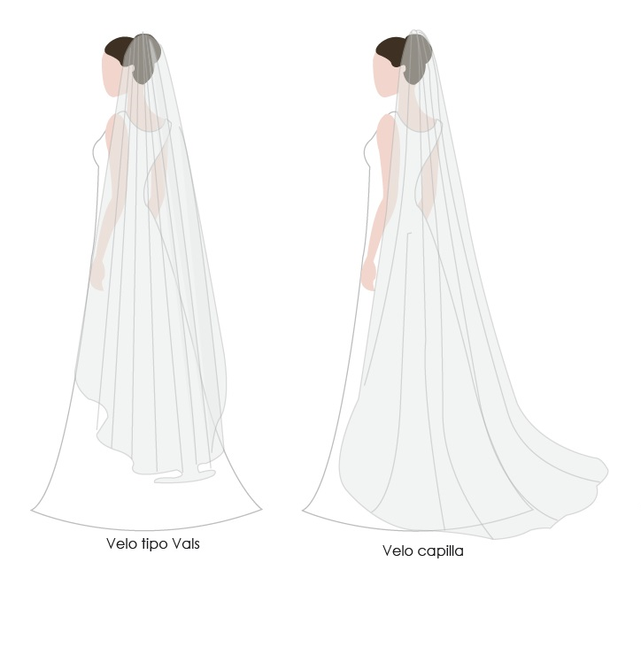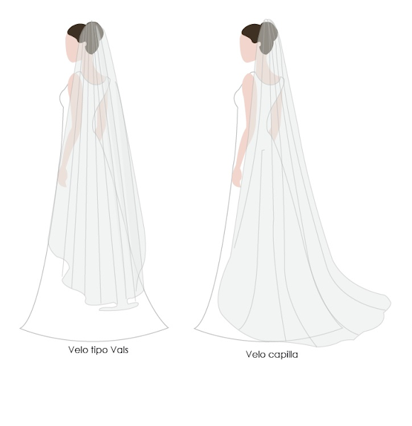 Estos dos últimos son variantes del velo catedral. El velo capilla es un poco más corto que el anterior, da más movilidad y no hay que estar tan pendiente de su largo o de que se arrugue. El velo tipo vals, no llega al suelo, lo que da mucha comodidad a la novia.