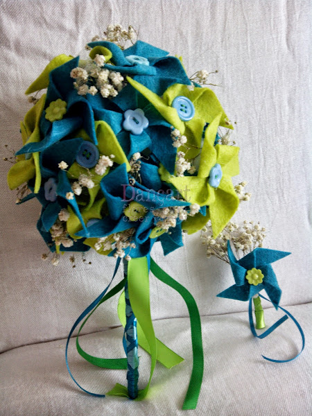Es un bouquet alegre de diseño original y diferente los materiales utilizados son "fieltro","botones"."cintas de colores", "baby breath".