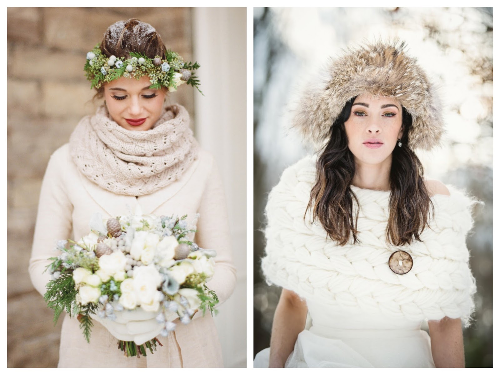 Novias abrigadas: Para las novias más frioleras, guantes, bufandas, estolas y gorros, complementos que quedan bien tanto con vestidos palabra de honor como con vestidos de tirantes. Pero si piensas que no es suficiente, puedes optar por un abrigo que tendrás que escoger de acuerdo al corte del vestido.