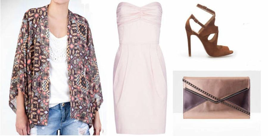 El siguiente modelo se va a basar en esta chaqueta de gasa también tipo kimono de estampados asimétricos de Stradivarius. En Mango hemos encontrado este vestido en tono rosa palo y palabra de honor, que podemos combinar con unas impresionantes sandalias en tonos marrones, como estas de Zara, y el bolso tipo sobre en tonos marrones metalizados de Stradivarius.Nos vestimos de largo