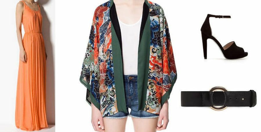 Para el tercer modelo hemos escogido este sencillo vestido largo de Massimo Dutti para acompañar a este kimono de Zara en estampados verdes y naranjas. Y, para rebajar color al conjunto, nos hemos decantado por el tono negro en los complementos, con estas sandalias de Zara y el cinturón de Mango.Para bodas de tarde