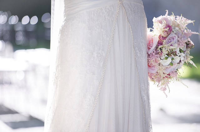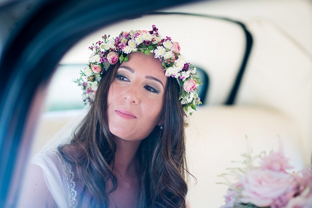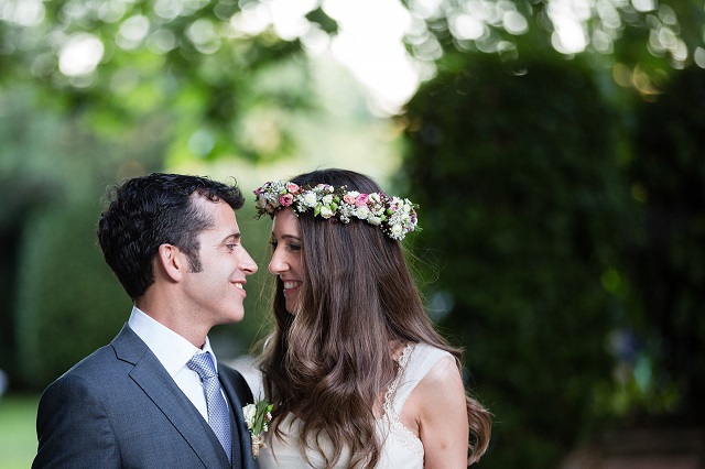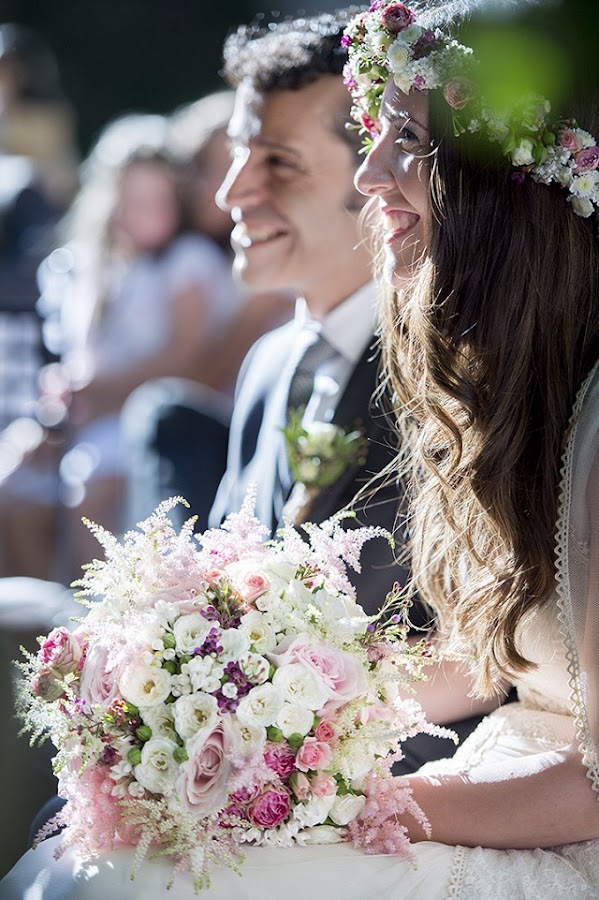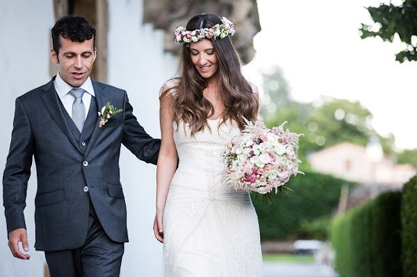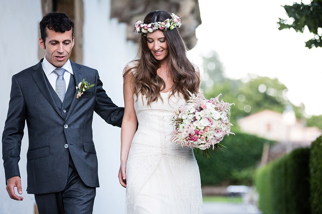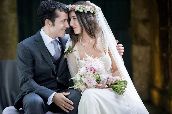 La novia lució espectacular un vestido de José María Peiró (Whiteday), que junto con un ramo y una corona de flores de Ombú Studio de los mismos tonos de la boda y de toda la decoración floral, hacían de Eva un look lleno de sencillez y elegancia,