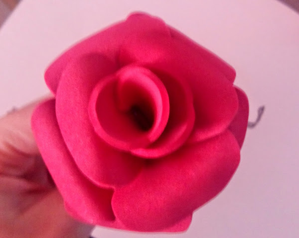 Hacemos lo mismo con los 8 pétalos y ahora vamos a montar la rosa. Ponemos silicona en el pico del pétalo y pegamos los pétalos uno a uno alrededor del capullo. Los tenemos que superponer pero de forma alternada para que quede bonito.