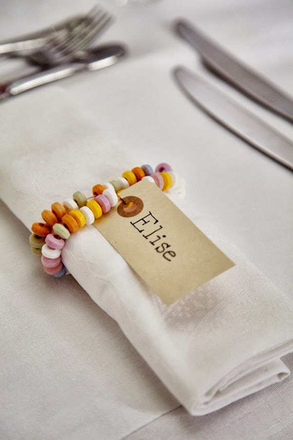La siguiente idea es sencilla a la par que resultona: una pulsera de caramelos haciendo las veces de servilletero "comestible". ¿No os parece una cucada?