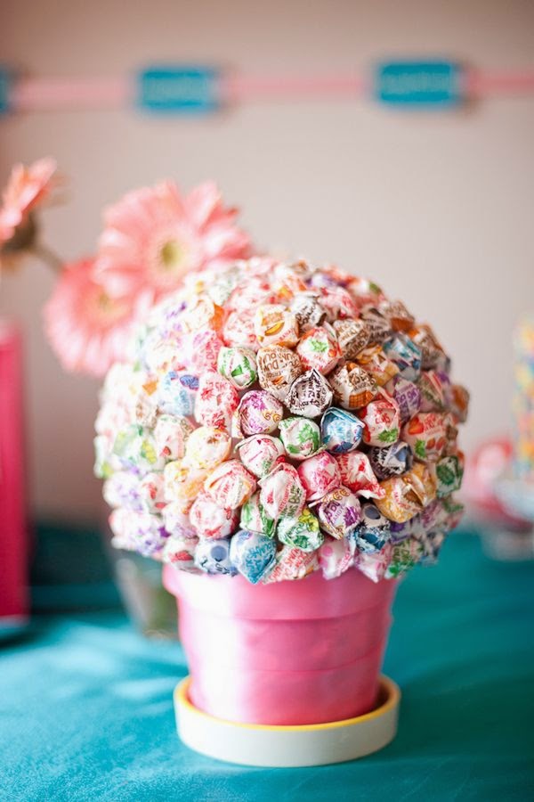 La decoración "floral" de la mesa infantil puede sustituirse por algo más apropiado para ellos, por ejemplo globos o estos originales bouquets hechos con chupa chups: