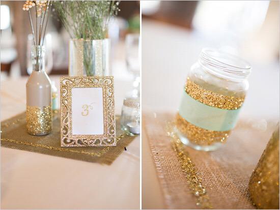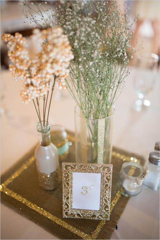 Frascos y botellas; ¿Quién no tiene algún frasco o botellas de vidrio en casa? Sólo te falta cintas de colores o purpurina para crear rincones de ensueño. Colócalos sobre una tela que le convine y busca flores efecto perla. ¡¡Ideal!!