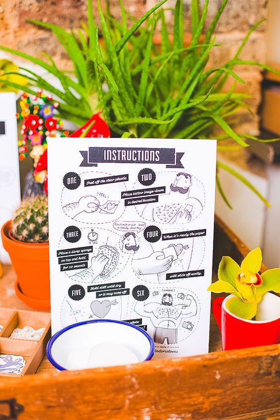 Necesitarás un cartel con el que dar la bienvenida a tus invitados al corner. En este cartel, explica que se tratan de tattoos temporales, muy fáciles de colocar. Mojando los tatuajes con un poco de agua quedan pegados a la piel y su duración aproximada es de un par de días.