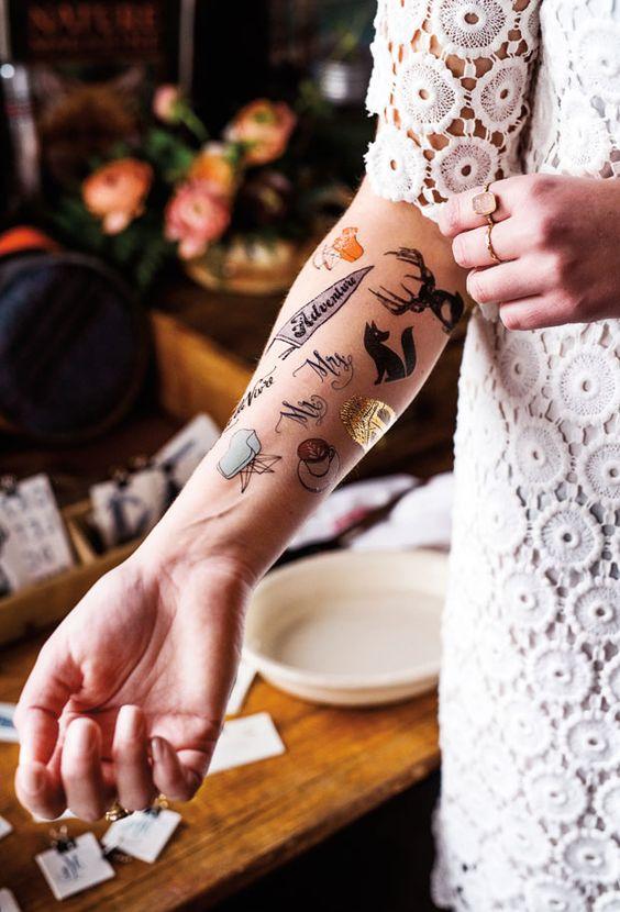 Coloca una cesta con un divertido surtido de tatuajes. Añade tatuajes “personalizados” sobre temas que hagan referencia a las aficiones de los novios: motos para bodas moteras, motivos de viajes para los aventureros, animales, corazones y flores para los románticos…
