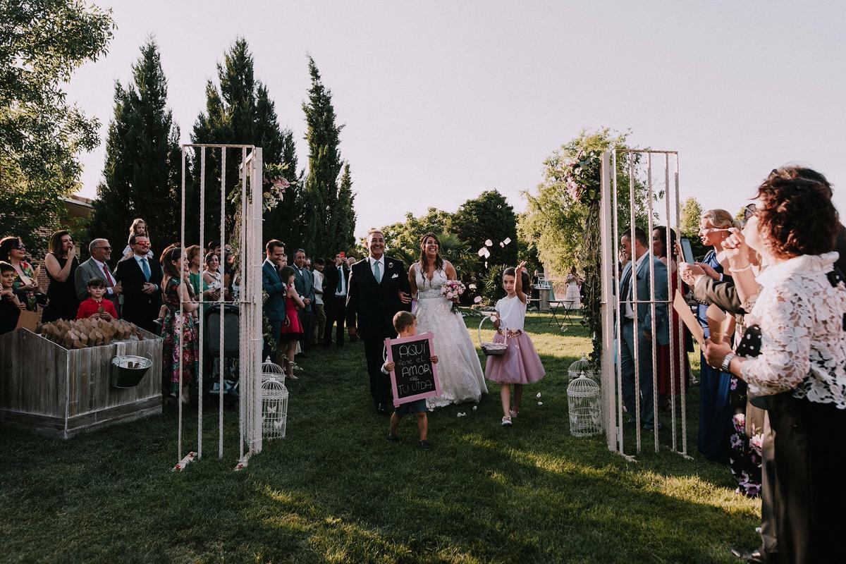 Algunos lugares al aire libre pueden parecer tan grandes que es necesario incorporar un elemento para que la boda sea más íntima, se puede crear alguna estructura de madera, de manera que imite una capilla al aire libre o cree un punto focal que deje claro dónde se llevará a cabo la ceremonia. Un arco floral o una pared con vegetación pueden ser una forma hermosa de designar un lugar para la ceremonia.Finca Prados Riveros – Casa del Palero