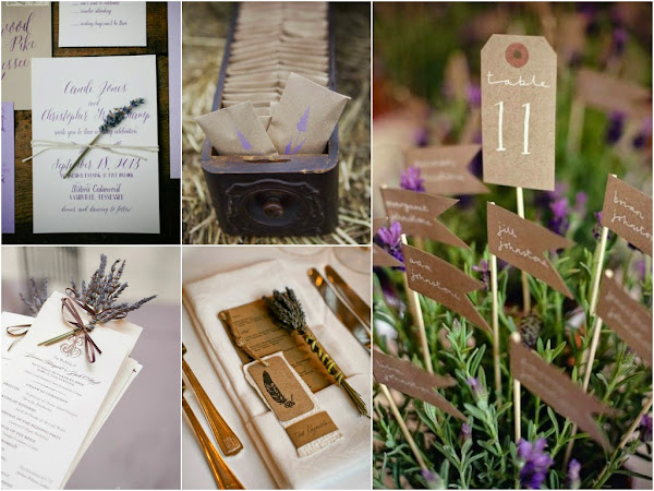 Otra opción es incorporarla a la papelería. Existen un montón de posibilidades: podéis colocar una ramita de lavanda seca en las invitaciones que, como os he comentado en otras ocasiones, son la carta de presentación de vuestra boda, en el seating plan, las minutas, el packaging de regalos para los invitados, notas de agradecimiento...