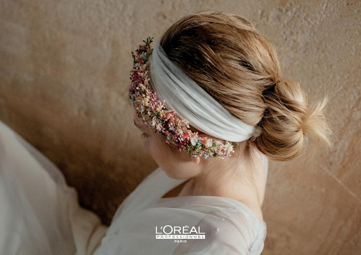 Otro tipo de motivos para personalizar nuestro peinado de boda pueden ser tiaras o coronas, como se ve en ésta primera foto, incluso gasas o pañuelos, y, por qué no??? podemos combinar varias opciones como por ejemplo ha hecho L´Oreal en éste modelo, combinando una corona de pequeñas flores de colores pastel con un pañuelo ligero blanco, de peinado, un moño bajo despeinado creando leves ondas.