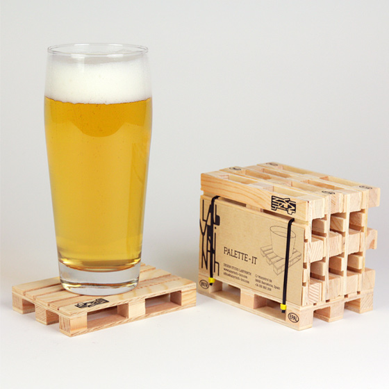 Juego de 5 posavasos réplicas exactas de los europalets. Además de ecológicos, están hechos a mano y diseñados por Design Studio Labyrinth.